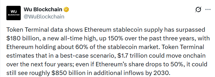 Начнём с самого показательного сигнала. Объём стейблкоинов в сети Ethereum превысил $180 млрд, установив новый исторический максимум. За последние три года рост составил около 150%, и сейчас Ethereum удерживает примерно 60% всего рынка стейблкоинов.