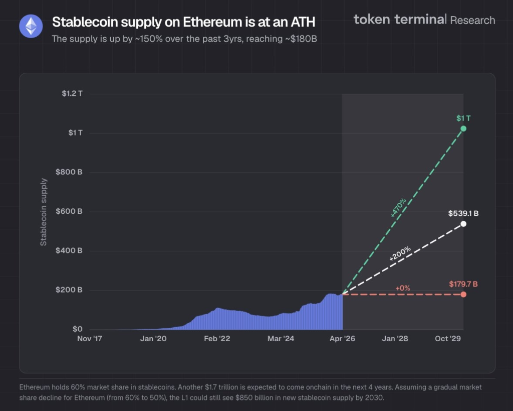 Прогнозы тоже звучат амбициозно. По оценкам аналитиков Token Terminal, в оптимистичном сценарии в ближайшие четыре года ончейн может «переехать» до $1,7 трлн. Даже если доля Ethereum снизится до 50% (что вполне реалистично на фоне роста конкуренции), это всё равно означает около $850 млрд потенциальных притоков к 2030 году.