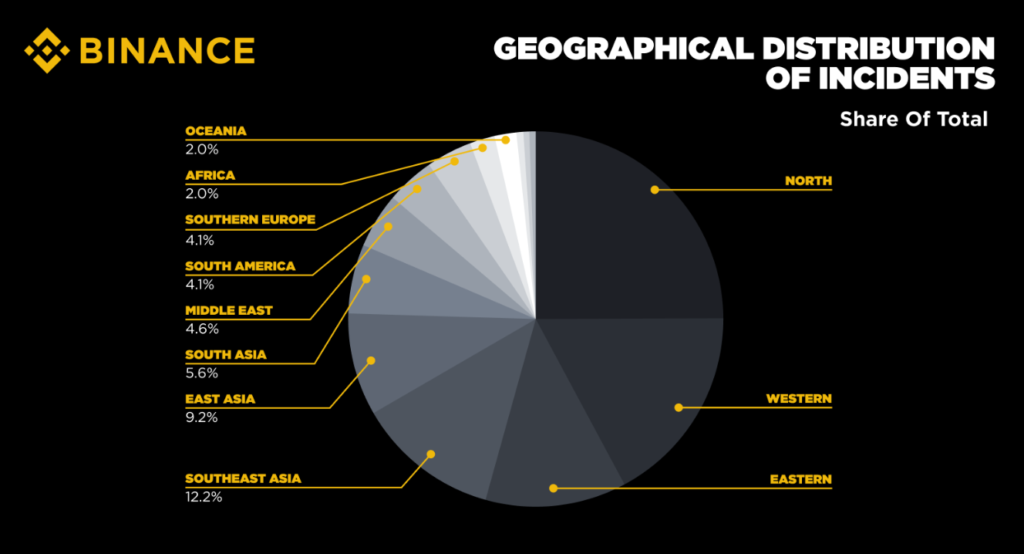 Случаи похищения людей с целью вымогательства криптовалюты по регионам с 2019 года. Источник: Binance