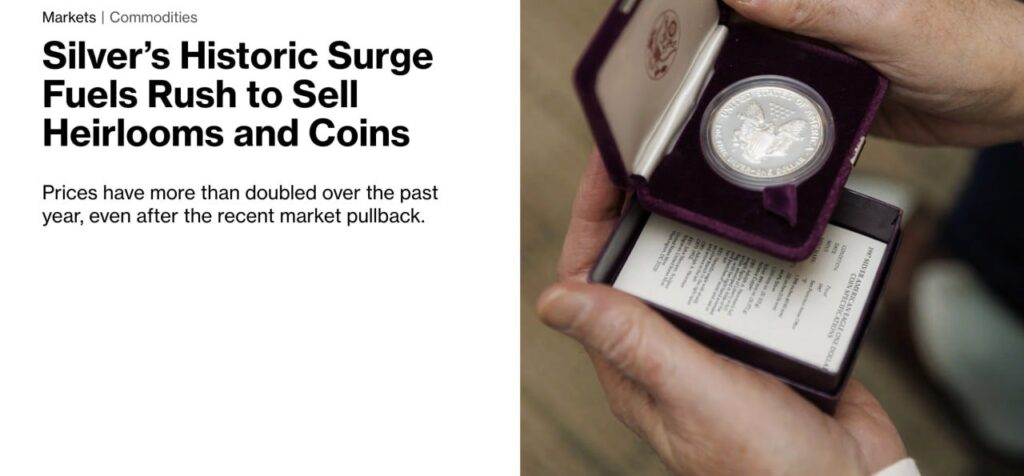 На фоне недавнего ралли цен на серебро многие жители США спешно достают из старых сундуков, бабушкиных чемоданов и семейных коллекций серебряные монеты, украшения, столовое серебро и даже антикварную посуду, чтобы сдать всё это в ломбарды. Как сообщает Bloomberg, поток серебра в пункты приёма буквально зашкаливает: покупатели и коллекционеры одновременно стараются зафиксировать прибыль и освободить место для новых приобретений.