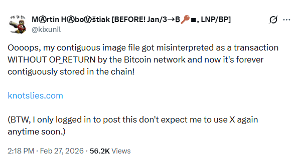 Словацкий программист Мартин Хабовштяк провёл показательный технический эксперимент, вызвавший оживлённую дискуссию в сообществе разработчиков биткоина. В рамках своей инициативы он встроил в блокчейн изображение размером 66 КБ, тем самым намеренно продемонстрировав возможность обхода предложенных ограничений по борьбе со спамом, описанных в BIP-110.