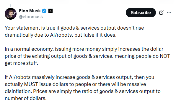 Elon Musk снова вмешался в дискуссию о будущем денег — и сделал это в своем стиле: одной фразой поставил под вопрос привычную экономическую логику. Его тезис звучит просто, но последствия у него далеко не простые: если искусственный интеллект и роботизация действительно кратно увеличат производство, классическая связь между эмиссией и инфляцией может перестать работать.
