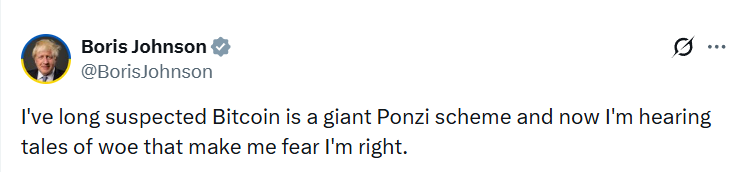 Бывший премьер-министр Великобритании Борис Джонсон вновь высказался о криптовалютах, заявив, что уже давно подозревает биткоин в сходстве с финансовой пирамидой. Его комментарии вызвали новую волну обсуждений вокруг природы цифровых активов, их ценности и устойчивости в долгосрочной перспективе.