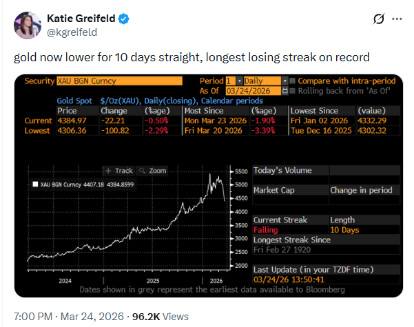 Рынок драгоценных металлов переживает один из самых необычных и в каком-то смысле символичных периодов за всю историю наблюдений. Золото, которое десятилетиями считалось главным защитным активом в периоды кризисов, демонстрирует затяжное падение, выбивающееся из привычной логики поведения рынков. По данным аналитика Bloomberg Кэти Грейфельд, цена на золото снижается уже десять торговых дней подряд — это самая продолжительная серия падения за всю историю наблюдений.