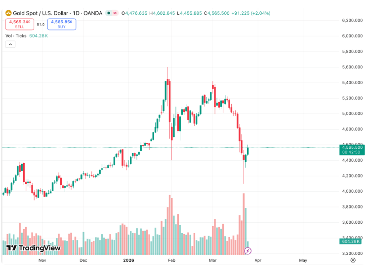 Масштаб снижения также впечатляет. От январского пика 2026 года золото потеряло до 27%, а только с конца февраля — около 12%. На 25 марта цена держится в районе 4565 долларов за унцию, хотя в моменте опускалась почти до 4100 долларов, что подтверждают данные TradingView. Для актива, который традиционно ассоциируется со стабильностью и сохранением капитала, такие движения выглядят нетипично и заставляют инвесторов пересматривать привычные модели поведения.