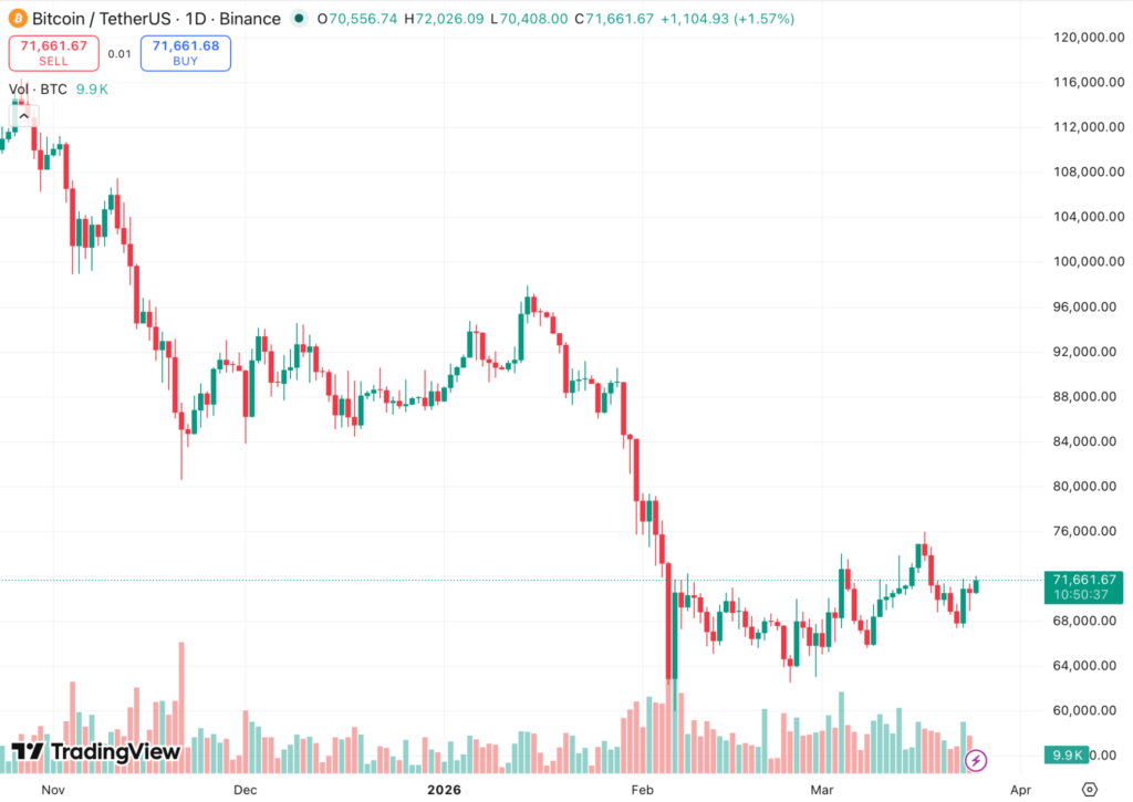 На момент подготовки материала биткоин торгуется в районе $ 71 661, по данным TradingView, удерживая ключевые уровни и демонстрируя устойчивость на фоне волатильной геополитической повестки.