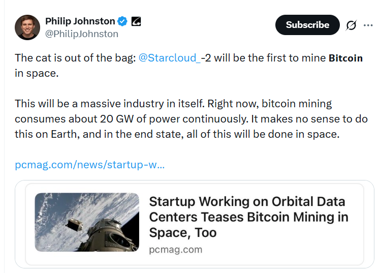 Главная идея — использовать орбиту как платформу для энергоэффективного майнинга. По словам Джонстона, добыча биткоина требует постоянного потребления около 20 ГВт энергии, и на Земле это экономически нецелесообразно. Космос же предлагает практически бесконечный и бесплатный источник энергии — солнечную. «Добыча биткоина на Земле бессмысленна в долгосрочной перспективе — рано или поздно всё должно уйти на орбиту», — добавил он.