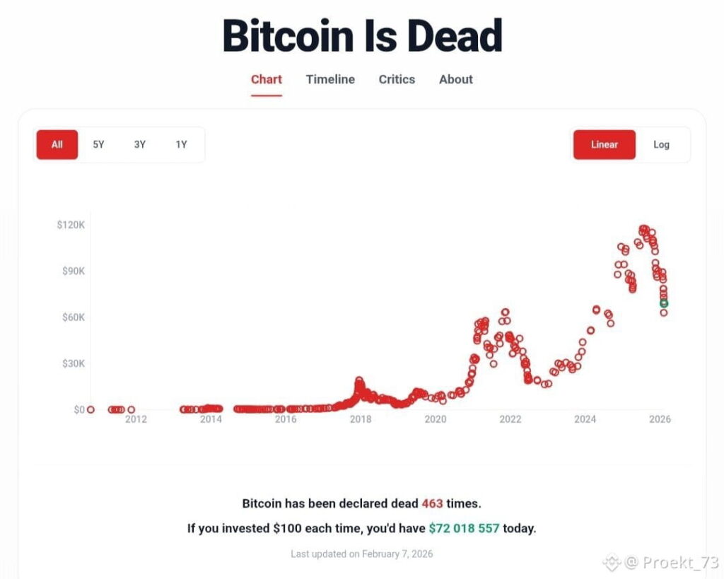 Сегодня биткоин «умер» уже 463 раза. И каждый раз рынок стоит перед одним и тем же выбором: поверить, что именно сейчас смерть настоящая, или сделать то, что история уже сотни раз вознаграждала — спокойно купить и переждать шум.