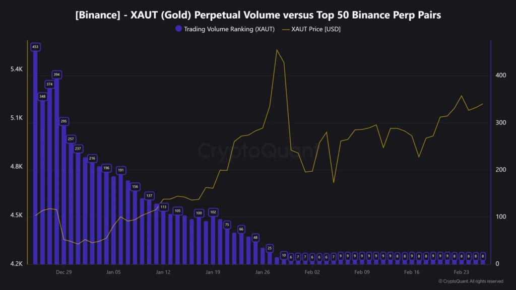 Динамика объема торгов XAUT и позиций в рейтинге бессрочных фьючерсов на Binance. Источник: CryptoQuant.