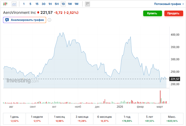 Акции американской оборонной компании AeroVironment оказались под заметным давлением после публикации последнего финансового отчёта. Несмотря на рост выручки и уверенные показатели бизнеса, реакция рынка оказалась сдержанной — инвесторы начали активно фиксировать прибыль, что привело к снижению котировок.