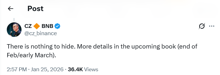 Finally, Zhao said that he will provide more detailed accounts of events and his experience in his own book, which is expected to be released at the end of February or early March 2026. It will not only be a memoir but also an analysis of the industry, management strategies, and a perspective on the role of major players in the global crypto ecosystem.