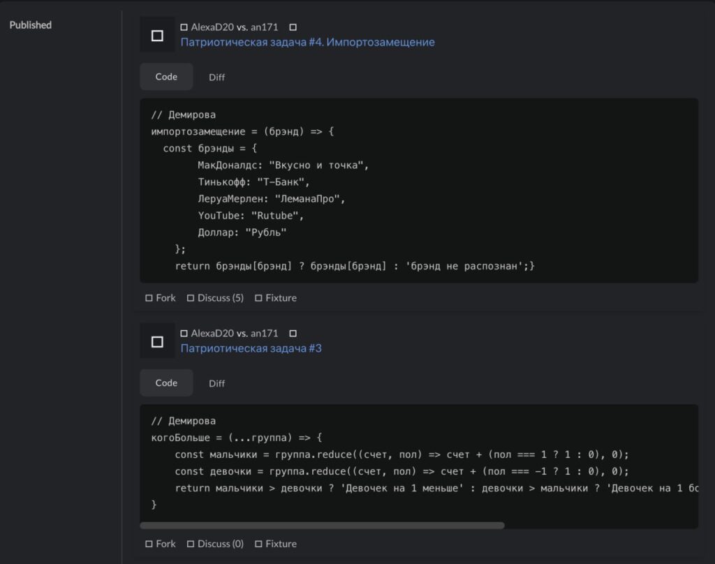The university’s instructors went beyond simply translating assignments or comments. They effectively created their own version of JavaScript with a Russified syntax and developed a dedicated educational platform. It includes gamification elements, a ranking system, and automatic task validation. Students solve problems, earn points, compete with each other, and write code exclusively in Cyrillic.