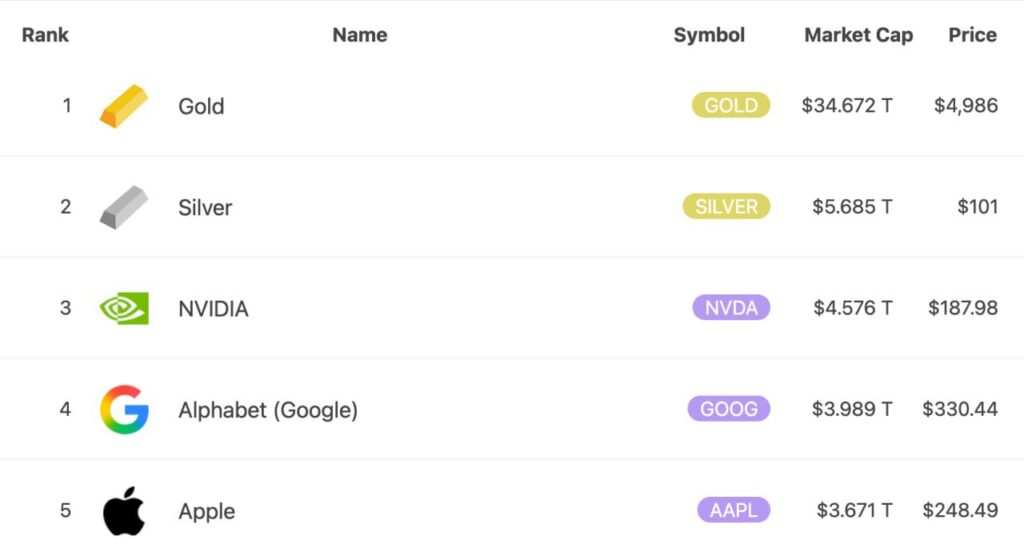 Silver is confidently returning to the big investment league, doing so without unnecessary noise but with very telling figures. The metal’s price has broken above the $100 per ounce mark, and in terms of total market capitalization, silver has risen to second place among all assets globally, trailing only gold and surpassing the largest technology corporations. In a single ranking, a metal with a thousand-year history now stands alongside giants such as NVIDIA, Apple, and Alphabet – a comparison that speaks volumes about the current state of the global market.