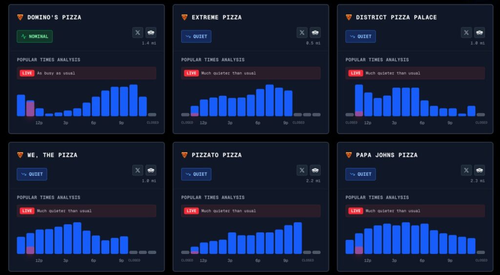 Why pizza specifically? Because it is the perfect “emergency food.” It requires no cutlery, is delivered quickly, is easy to scale for large groups, and is traditionally used in office and command environments in the United States. When on a normal weekday evening it is quiet around the Pentagon, and then suddenly at night orders from Domino’s, Papa John’s, and other chains multiply several times, it almost always means that something unusual is happening inside the building.