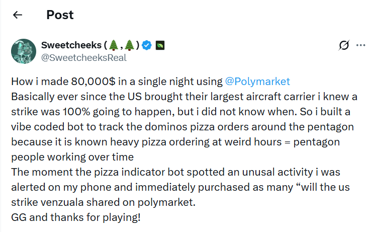 Recently, this principle was used not just for observation, but for real trading. One trader managed to earn around $80,000 by placing a bet on the Polymarket platform on developments around Venezuela. He assumed that the probability of a US strike was high, but the exact timing was unknown. Instead of guessing based on news and political statements, he wrote a simple bot that tracked late-night anomalies in pizza orders near the Pentagon.