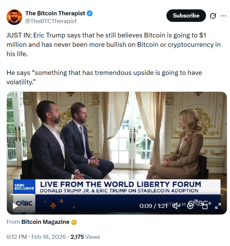 Эрик Трамп вновь оказался в центре криптодискуссий, заявив, что по-прежнему уверен в том, что биткоин способен достичь отметки в $1 млн. Более того, по его словам, он никогда в жизни не был настолько оптимистично настроен в отношении BTC и криптовалют в целом. Это заявление быстро разлетелось по соцсетям и стало очередным поводом для разговоров о том, насколько глубоко криптовалюта уже проникла в политические и финансовые элиты США.
