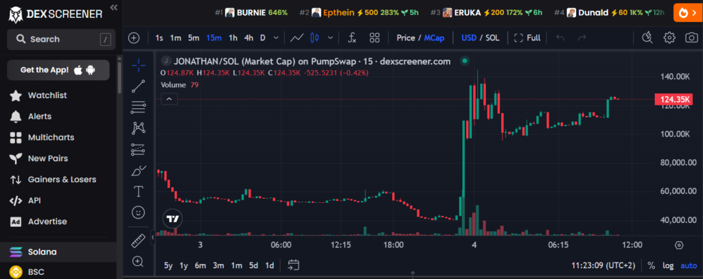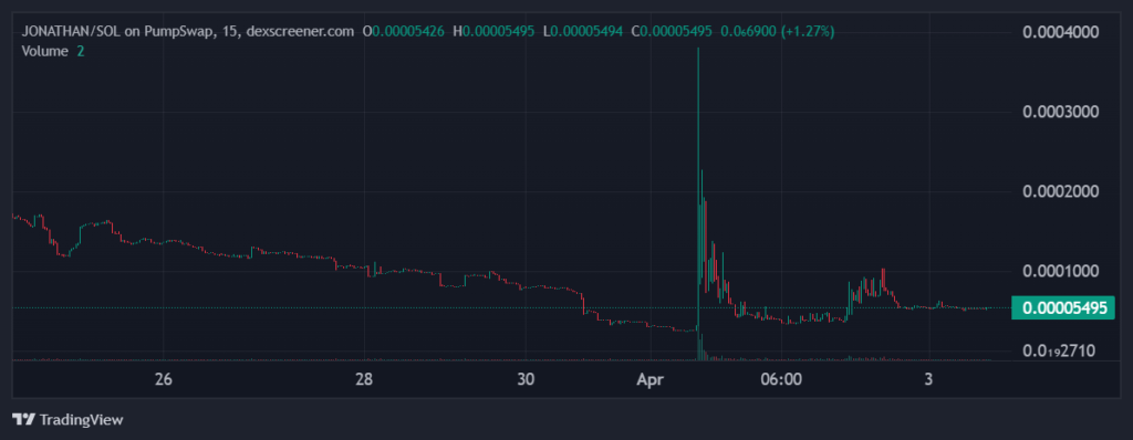 На фоне вирусного распространения сообщения в сети Solana резко взлетел мемкоин JONATHAN. По данным платформы DEX Screener, в моменте цена токена выросла более чем на 1400%, достигнув уровня около 0,00038 доллара.