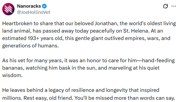 Согласно публикации, которую разместил аккаунт, выдававший себя за ветеринара Джо Холлинса, 193-летний Джонатан якобы скончался. Пост был написан в эмоциональном стиле и быстро разошёлся по платформе. В тексте говорилось о многолетнем уходе за животным, о том, как его кормили с рук и наблюдали за его спокойной жизнью. Всё выглядело достаточно убедительно, чтобы вызвать реакцию аудитории.