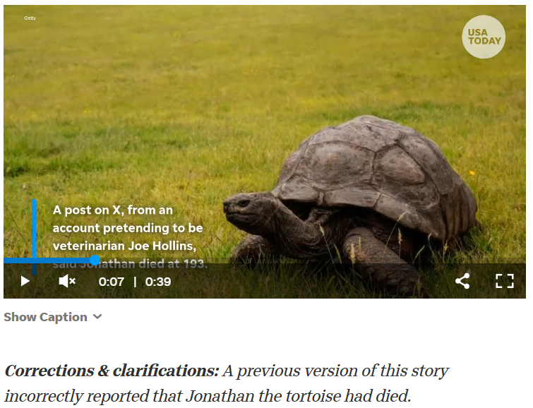 Сама история развивалась стремительно. Новость о «смерти» Джонатана подхватили не только пользователи, но и некоторые медиа, не успевшие проверить источник. Только спустя время информация была опровергнута. Аккаунт, с которого была сделана публикация о смерти черепахи, уже удален. Однако непосредственно сама заметка осталась.