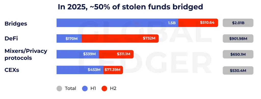 Global Ledger подчеркивает, что во втором полугодии злоумышленники стали активнее использовать некастодиальные кошельки, DeFi-протоколы, децентрализованные биржи (DEX), кроссчейн-мосты и миксеры. Это отражает общий сдвиг криптопреступности в сторону инфраструктуры, которая сложнее контролируется регуляторами и менее подвержена блокировкам.
