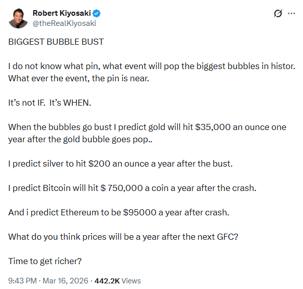Своё видение будущего инвестор изложил в публикации в X, где также представил прогнозы по ключевым активам на посткризисный период. Помимо биткоина, он ожидает резкий рост цен на традиционные защитные инструменты: золото, по его оценке, может достичь $35 000 за унцию, серебро — $200. В криптосегменте Кийосаки делает ставку не только на биткоин, но и на Ethereum, который, по его мнению, способен вырасти до $95 000.