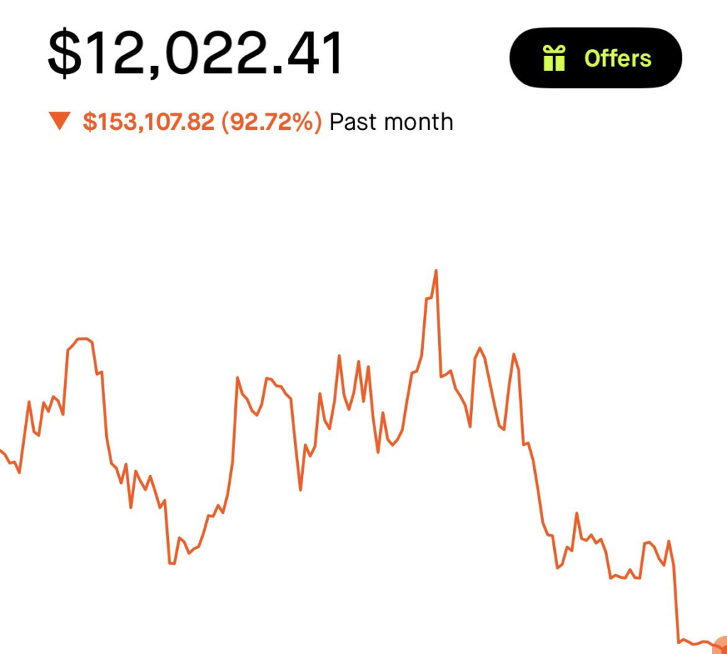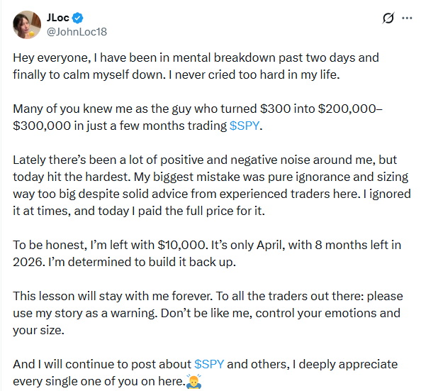 Сегодня он опубликовал прощальный пост. Без пафоса, без мемов — просто честный разбор своего провала. За последние недели, делая ставку на падение рынка, он практически обнулил счёт. От сотен тысяч остались примерно $10 000–$12 000.