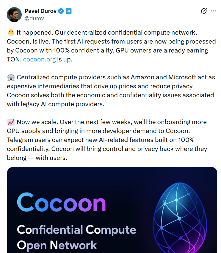 Экономическая модель сети также децентрализована. Владельцы GPU по всему миру могут подключаться к сети, предоставлять вычислительные ресурсы и получать вознаграждение в TON за выполненные задачи. Это превращает Cocoon в глобальный рынок ИИ-вычислений, где предложение и спрос формируются не одним облачным провайдером, а всей экосистемой.