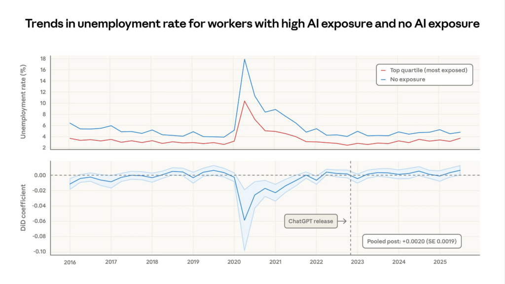 Сравнение темпов роста безработицы среди двух категорий работников. Источник: Anthropic.
