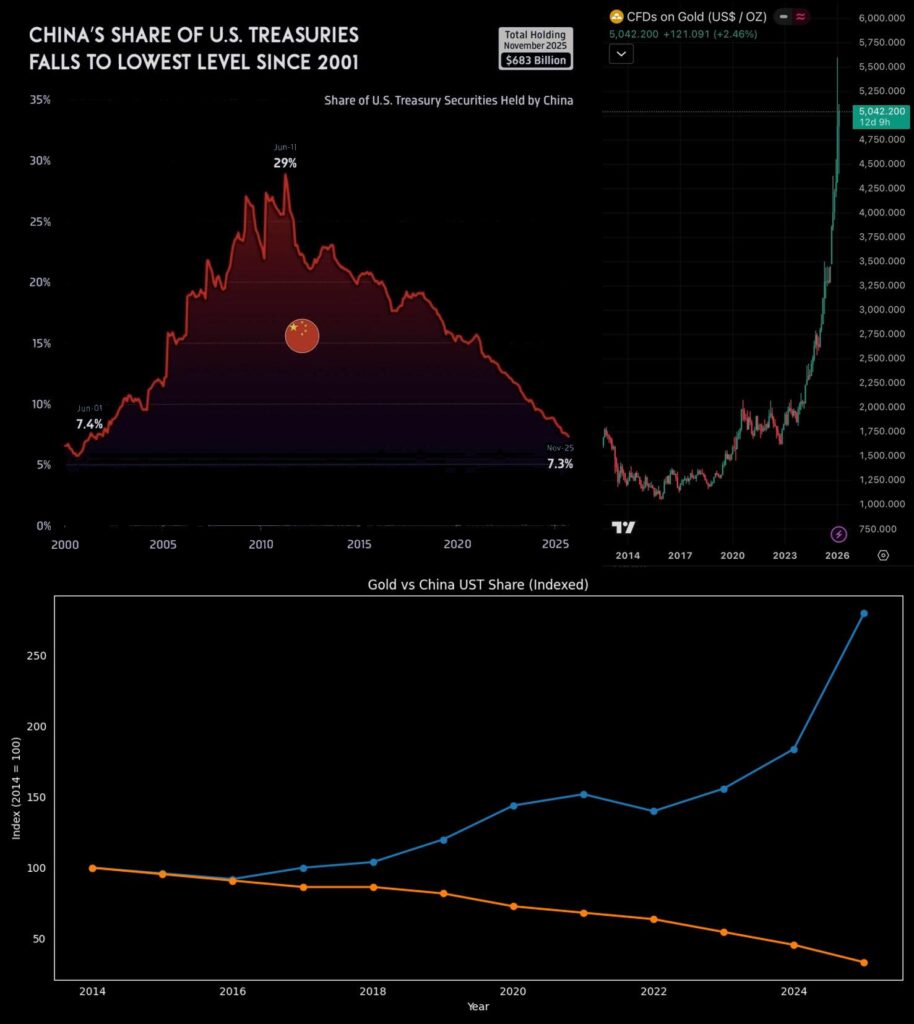 Цифры говорят громче любых заявлений. Доля китайских вложений в казначейские облигации США в общем объеме иностранных инвестиций упала до 7,3% — это минимальный уровень с 2001 года. Для сравнения: в июне 2011 года Китай находился на пике своего участия, контролируя около 28,8% иностранных вложений в американский долг. С тех пор показатель сократился на 21,5 процентного пункта.