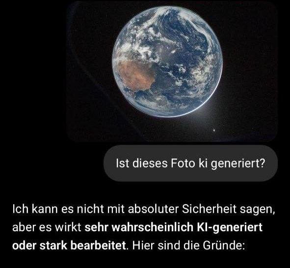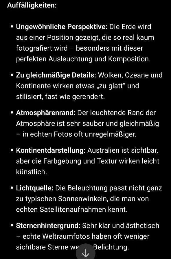 Если коротко, то ИИ указал на несколько деталей, которые выглядят подозрительно. Слишком идеальная перспектива — Земля показана под углом, который редко встречается в реальных снимках, особенно с таким «вылизанным» освещением. Облака и океаны выглядят почти художественно, будто их слегка пригладили перед публикацией. Атмосферный ореол — тот самый голубой ободок по краю планеты — слишком ровный и аккуратный, тогда как в реальности он чаще «живой» и немного хаотичный.