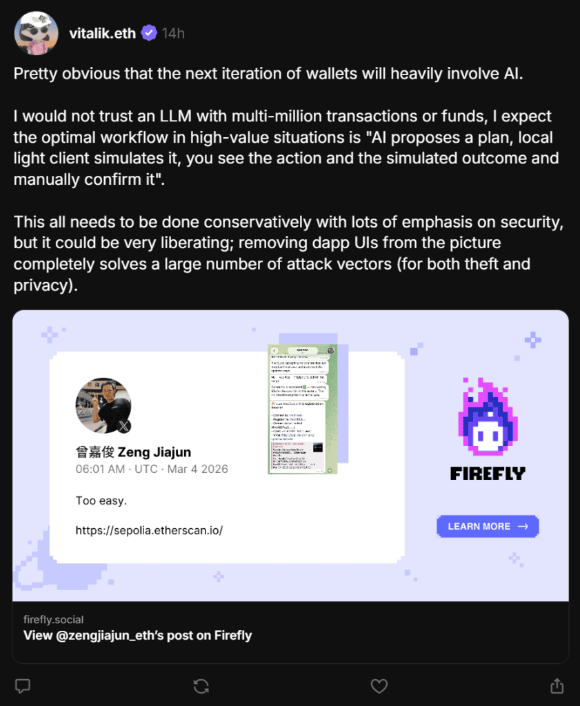 Бутерин также отметил, что переход к ИИ-ориентированным кошелькам может изменить саму структуру взаимодействия с децентрализованными приложениями. Сегодня пользователи обычно работают с так называемыми dApps — веб-интерфейсами, которые подключаются к криптокошельку. Однако именно такие интерфейсы часто становятся источником уязвимостей. Фишинговые сайты, вредоносные контракты или поддельные интерфейсы могут заставить пользователя подписать опасную транзакцию.