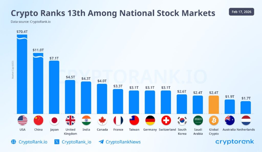 По данным CryptoRank, глобальная капитализация криптовалютного рынка достигла $2.4 трлн. Это не просто большая сумма — это уровень, сопоставимый с крупнейшими национальными фондовыми рынками планеты. Фактически крипторынок уже занимает 13-е место в мире, если сравнивать его с фондовыми биржами отдельных стран.