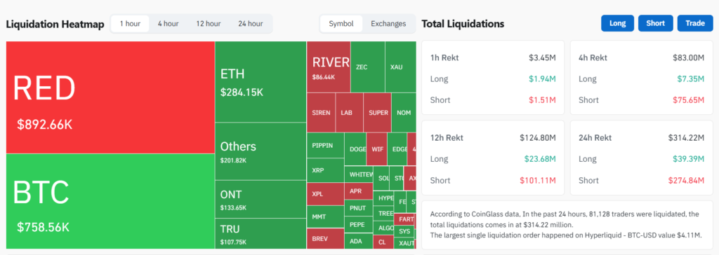 Ликвидации усилили движение. Резкий рост цен спровоцировал классический эффект короткого сжатия. По данным CoinGlass, за последние 24 часа ликвидации составили около $255 млн, причём 73% из них пришлись на короткие позиции. Это означает, что значительная часть трейдеров ожидала продолжения снижения и занимала шорт-позиции. Когда рынок пошёл вверх, эти позиции начали принудительно закрываться.