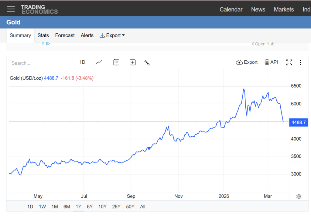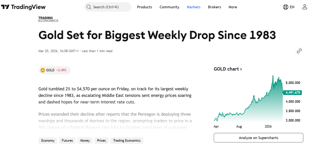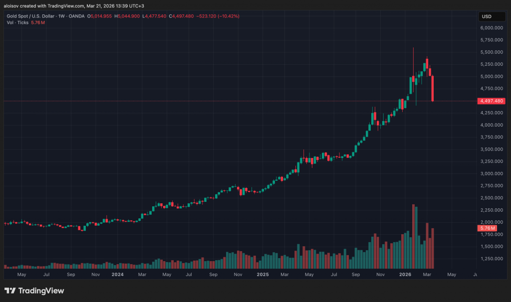 Рынок золота, который ещё недавно выглядел как образец стабильности на фоне глобального хаоса, внезапно показал, что даже «вечные ценности» умеют падать — и падать больно. За неделю с 16 по 20 марта металл потерял сразу 11%, опустившись до $4 488 за унцию. Это крупнейшее недельное снижение с 1983 года — события, которое до сих пор считалось почти «историческим исключением», а теперь внезапно получило современное продолжение.