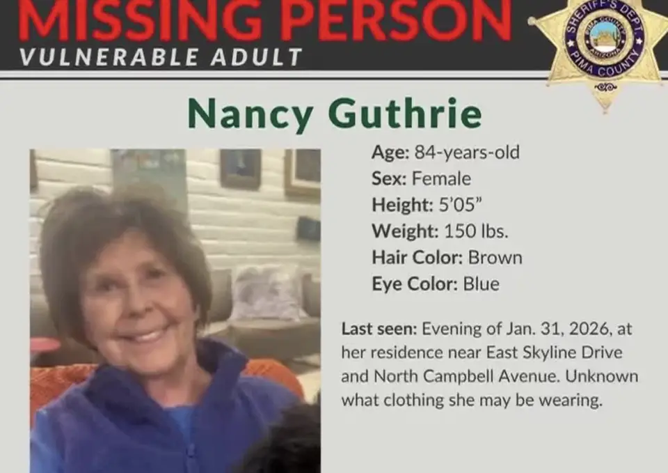Правоохранительные органы разыскивают 84-летнюю Нэнси Гатри (Nancy Guthrie) — мать известной американской телеведущей программы Today Саванны Гатри (Savannah Guthrie). Пожилая женщина пропала при загадочных обстоятельствах, а спустя несколько дней неизвестные лица отправили сообщение с требованием многомиллионного выкупа в криптовалюте за ее освобождение. Как сообщает Fox News, Нэнси Гатри пропала вечером 31 января, выйдя из своего дома в Аризоне.