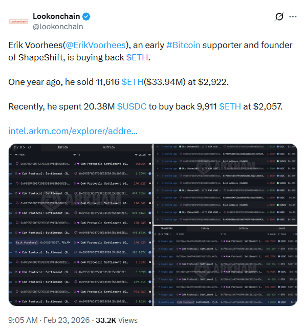 Интерес к рынку проявляют и известные участники криптосообщества. Аналитики Lookonchain отметили возвращение Эрика Ворхеса. Год назад он продал 11 616 ETH на сумму 33,94 млн долларов по цене 2922 доллара. 22 февраля он направил 20,38 млн USDC на обратный выкуп 9911 ETH по средней цене 2057 долларов. Подобные шаги нередко воспринимаются как сигнал о том, что крупные инвесторы считают текущие уровни привлекательными для входа.