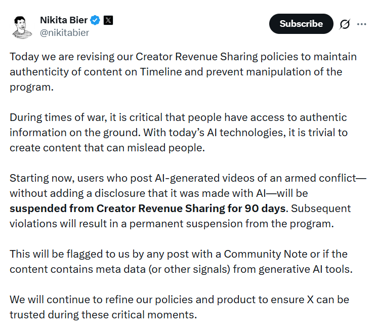 Социальная сеть X объявила о введении временных ограничений на монетизацию для пользователей, публикующих сгенерированные видео вооружённых конфликтов без соответствующей маркировки. Об этом сообщил директор по продукту алгоритмической ленты платформы Никита Бир.