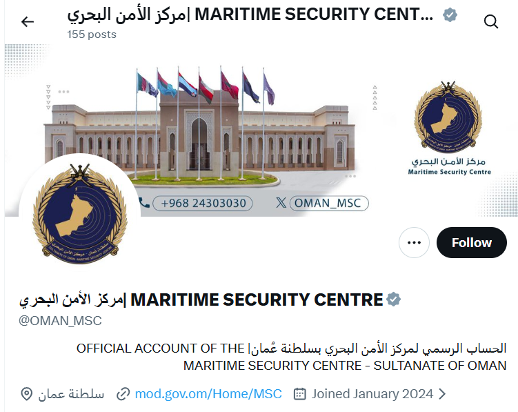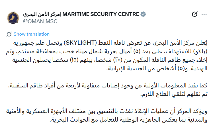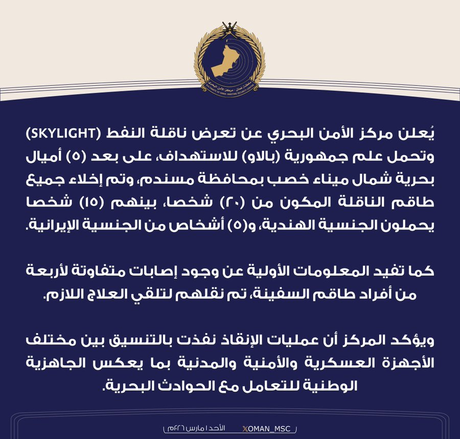 Центр морской безопасности объявляет о том, что нефтяной танкер (SKYLIGHT), идущий под флагом Республики Палау, подвергся атаке на расстоянии пяти морских миль к северу от порта Хасаб в провинции Мусандам. Весь экипаж танкера в составе 20 человек был эвакуирован, среди них 15 граждан Индии и 5 граждан Ирана.