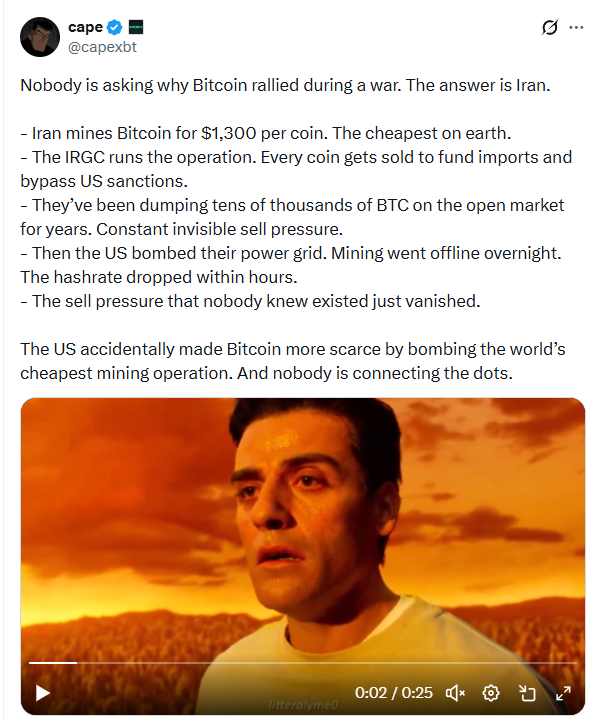 На фоне последнего роста Bitcoin на рынке появилась любопытная, но довольно спорная теория, которую активно обсуждают в X. Суть её в том, что один из факторов укрепления цены BTC может быть связан вовсе не с классическими драйверами вроде институционального спроса или макроликвидности, а с событиями на Ближнем Востоке, в частности с ситуацией вокруг Иран.
