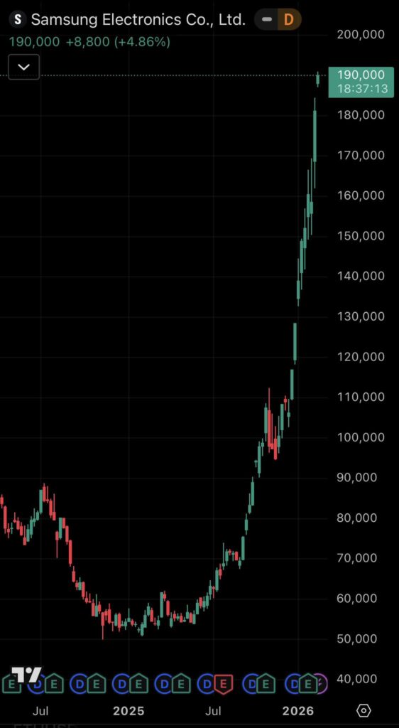 Samsung сейчас растет так, что золото и серебро начинают нервно поправлять короны. И главное: это не просто спекулятивный скачок. Это отражение того, что Samsung наконец-то воспринимается рынком не как “производитель смартфонов”, а как один из ключевых инфраструктурных игроков новой AI-экономики.