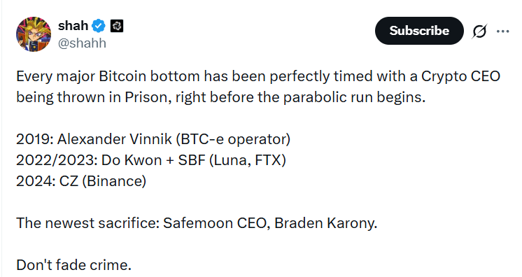 Автор вирусного поста в X даже сформулировал это почти как правило: «Каждое крупное дно биткоина идеально совпадает с тем, что очередного крипто-CEO отправляют в тюрьму — прямо перед тем, как начинается параболический рост».