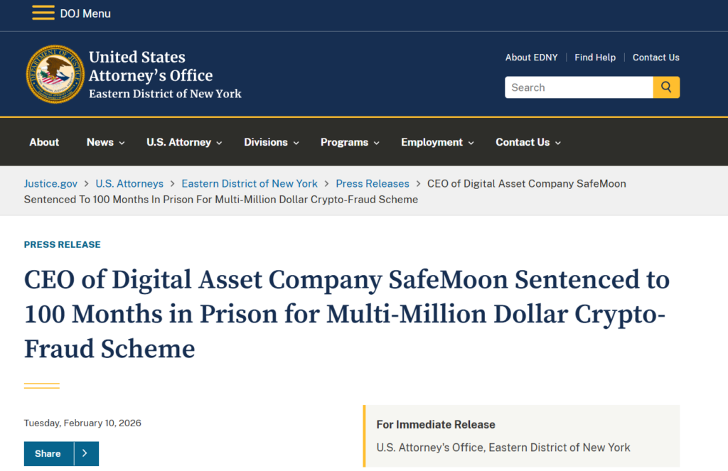 10 февраля 2026 года CEO SafeMoon Брейден Карони получил 100 месяцев тюрьмы. И именно в этот момент биткоин торгуется ниже $70 000, уже откатившись после падения с недавних $126 000. Рынок снова выглядит так, будто переживает болезненную фазу охлаждения: страх, распродажи, сомнения, разговоры о том, что «цикл закончился».