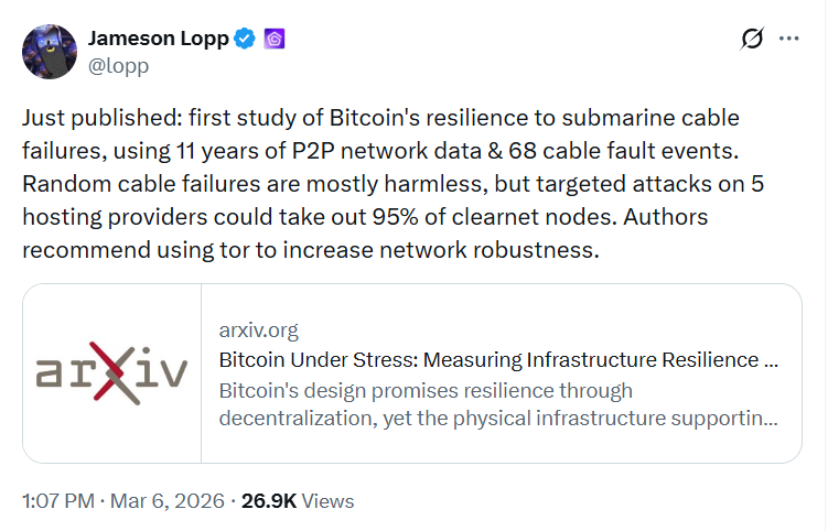 Хотя физическая инфраструктура вроде подводных линий связи вызывает интерес, исследователи Кембриджского университета пришли к выводу, что их повреждения практически не влияют на сеть биткоина. За 11 лет анализа 68 аварий на линиях связи среднее падение числа узлов составило всего 1,5%, а корреляция с ценой — нулевая. Для отключения 10% нод потребовалось бы нарушить от 72% до 92% всех межконтинентальных линий.
