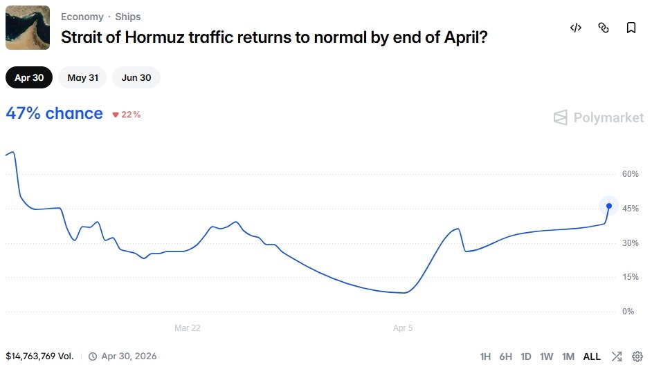 Ситуация вокруг Ормузский пролив постепенно начинает смещаться из фазы острой неопределенности в режим осторожного восстановления — и рынок реагирует на это быстрее, чем официальные заявления. После сообщений о проходе первых восьми нефтяных танкеров через ключевую артерию мировой торговли нефтью, вероятность того, что судоходство вернется к «нормальному состоянию» к концу апреля, на платформе Polymarket резко выросла до 47%.
