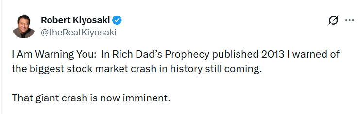 В своем обращении он напомнил, что еще в 2013 году в книге «Пророчество Богатого папы» предупреждал о том, что крупнейший крах фондового рынка впереди. Тогда это звучало как гипотеза, как драматический прогноз на далекое будущее. Сегодня же он утверждает: момент наступает прямо сейчас. Обвал, о котором он говорил более десяти лет назад, становится «неминуемым».