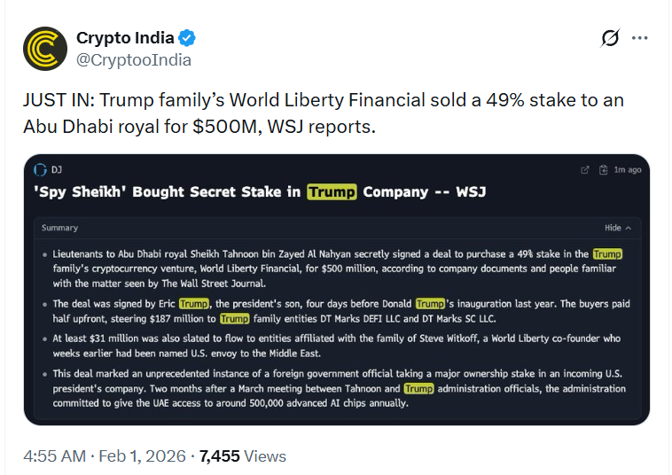 JUST IN: По данным Wall Street Journal, семья Трамп продала 49% своей компании World Liberty Financial королевскому инвестору из Абу-Даби за 500 миллионов долларов.