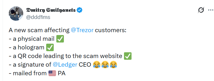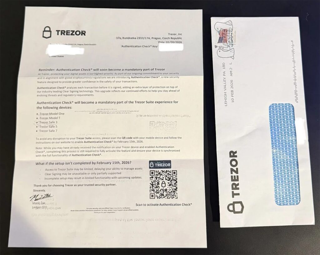 Мошенники снова атакуют владельцев аппаратных криптокошельков Trezor и Ledger, используя поддельные письма, которые выглядят как официальная корреспонденция от компаний, но на самом деле служат для кражи сид-фраз и доступа к кошелькам.