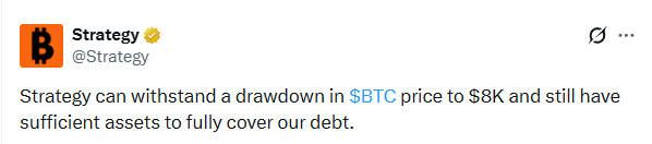 В официальном сообщении в X Strategy написала буквально следующее: «Мы можем выдержать падение цены BTC до $8 000 и все равно будем иметь достаточно активов, чтобы полностью покрыть наш долг».