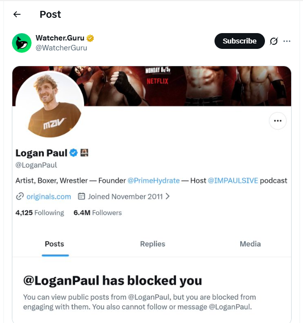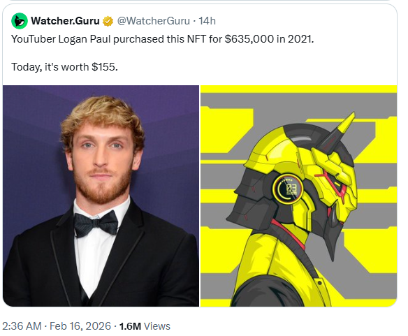 Пока биткоин нервничает, в соцсетях появился новый жанр развлечений: напоминать знаменитостям об их потерях на NFT в прошлом цикле. WatcherGuru запустил волну постов, где публичным людям припоминают, сколько они потеряли на “цифровых обезьянах” и хайповых коллекциях. Логан Пол — один из главных героев этой рубрики. Его NFT, который когда-то стоил $635k, укатался до $155. Говорят, он уже натер палец, выписывая баны за такие шутки. Крипторынок не забывает. Особенно когда дело касается чужих убытков.