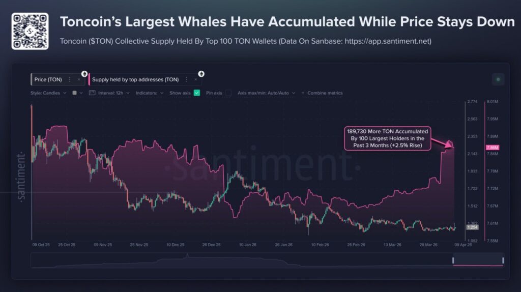 По данным Santiment, за последние три месяца 100 крупнейших адресов в сети TON увеличили свои запасы на 189 730 TON, что составляет примерно +2,5% к их совокупным активам. На первый взгляд цифра может показаться не драматичной, но в контексте текущего рынка это важный сигнал. Крупные держатели не просто «не продают» — они системно наращивают позиции.